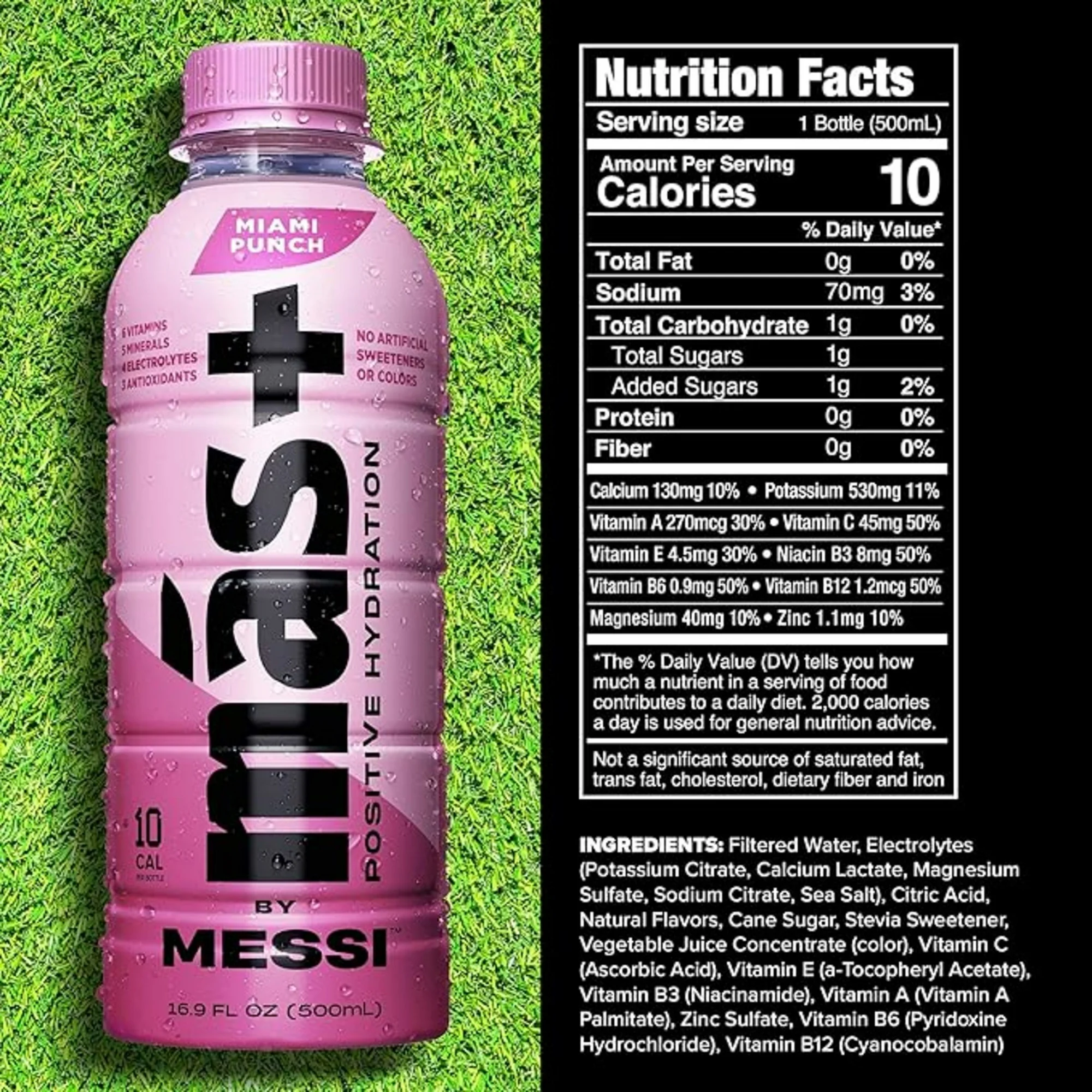 You wake up feeling dehydrated. Through daily activity—whether you’re on the field, at work, or running errands—staying properly hydrated is essential. That’s where Más+ by Messi comes in, helping to replenish the electrolytes lost throughout the day. Más+ by Messi is hydration for every waking hour. With a balanced blend of hydrating electrolytes, an excellent source of vitamins, minerals, and antioxidants, plus amazingly refreshing taste, you’ll want to drink even more—más. We call it Positive Hydration. We made Más+ with the world’s greatest soccer player, Lionel Messi, because no one better understands the importance of hydration on and off the field. He couldn’t find a drink with the hydration he needed and great taste he loved, so he went to work on one of his own. Without compromise on ingredients, almost unbelievable taste. With natural flavors, just 10 calories and 1g of sugar per 16.9oz bottle, and no artificial sweeteners or colors. Más+ by Messi comes in 5 amazing flavors loved by Messi and inspired by his achievements: Miami Punch; Limón Lime League; Orange d’Or; Berry Copa Crush and Greatest Grape. Because Messi believes we all deserve to feel like champions in every part of our life.