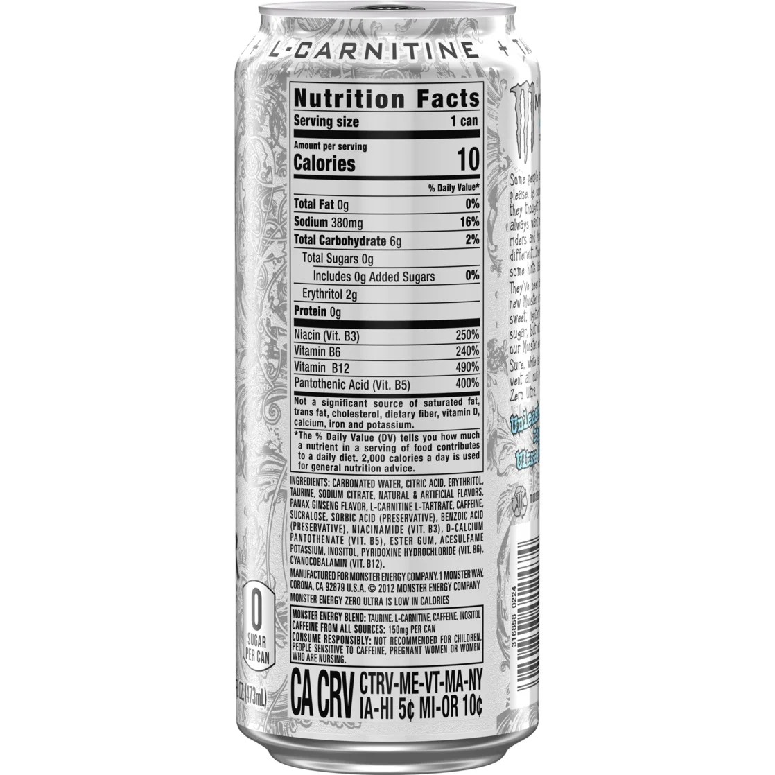 - FULL FLAVOR, ZERO SUGAR: Zero Ultra has 10 calories and zero sugar, but with all the flavor you’re accustomed to and packed with our sugar-free Monster Energy blend, making it an ideal energy drink choice.